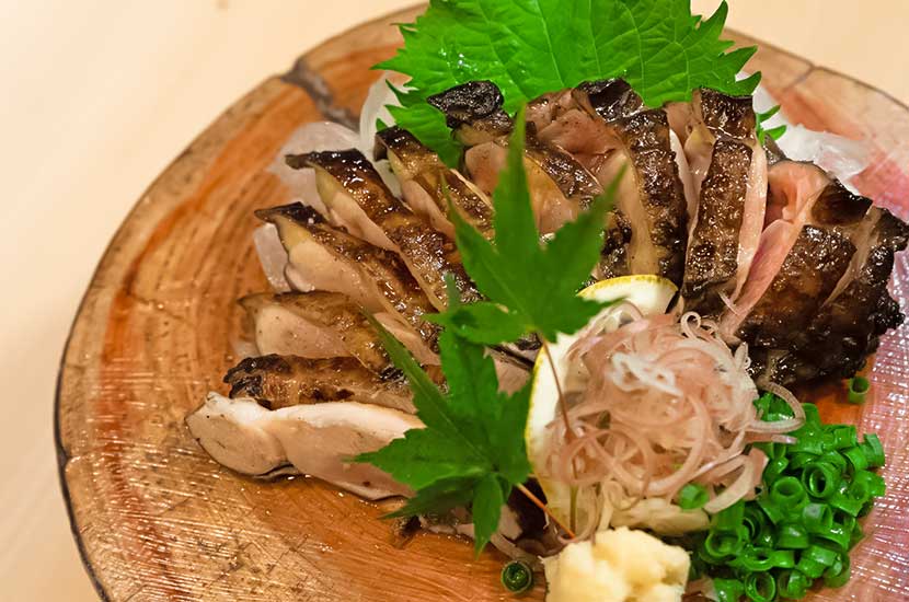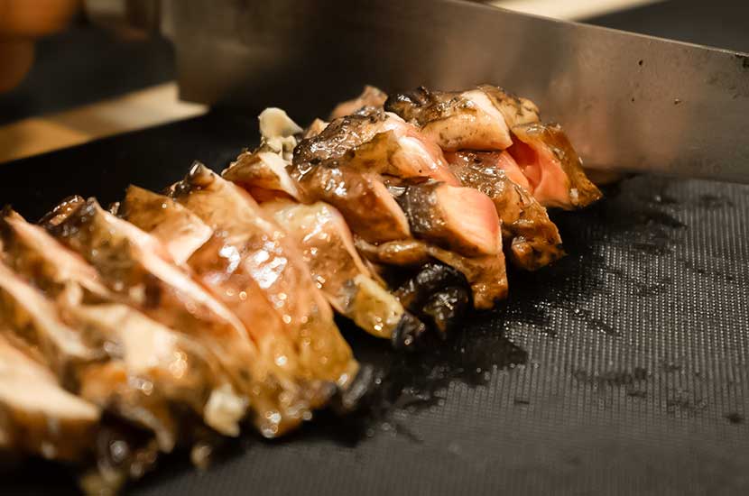 松葉を使い魚や鶏・牛などを一気に焼き上げます。わら焼きと比べても、表面はより香ばしく香り豊かに仕上がるのが松葉焼の特徴。食べた瞬間に香る松葉の風味、パリッとした皮の食感、旨みが閉じ込められた食材のジューシーさ、それらのハーモニーをぜひ味わいください。松葉の香りが食材の臭みを消す役割も兼ねており、どなたでも食べやすい逸品です。